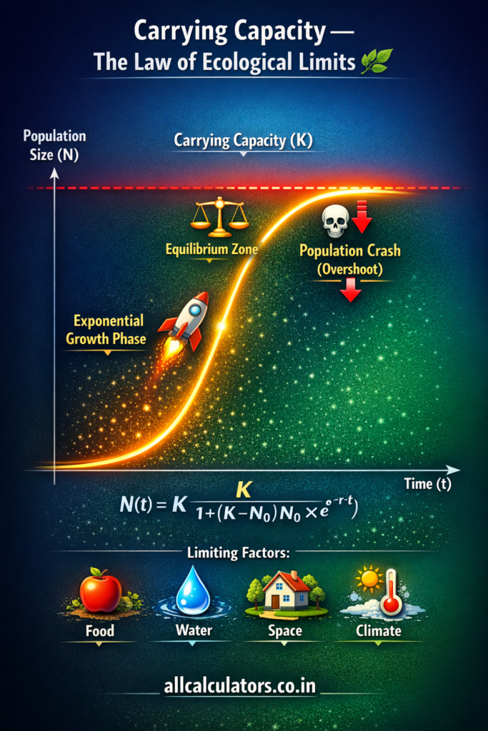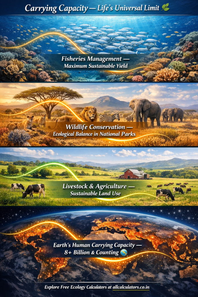 Our Carrying Capacity Calculator is built on verified scientific formulas, designed for speed, accuracy, and ease — making it the ideal tool for students, educators, researchers, wildlife conservationists, urban planners, and eco-enthusiasts worldwide. 🌿🔬📈