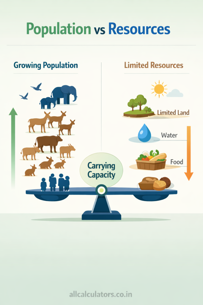 ⚠️ This Carrying Capacity Calculator provides estimated results based on standard ecological formulas and user inputs. Actual carrying capacity may vary due to dynamic environmental factors such as climate change, resource fluctuations, and human intervention.