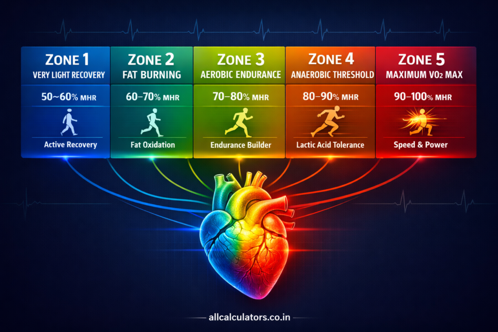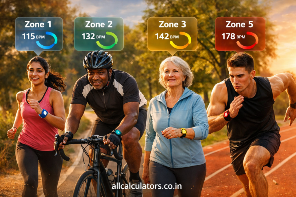 ⚠️ This Heart Rate Zones Calculator provides estimated values based on standard formulas such as maximum heart rate (220 − age). Individual fitness levels, medical conditions, and physiological differences may affect actual results.